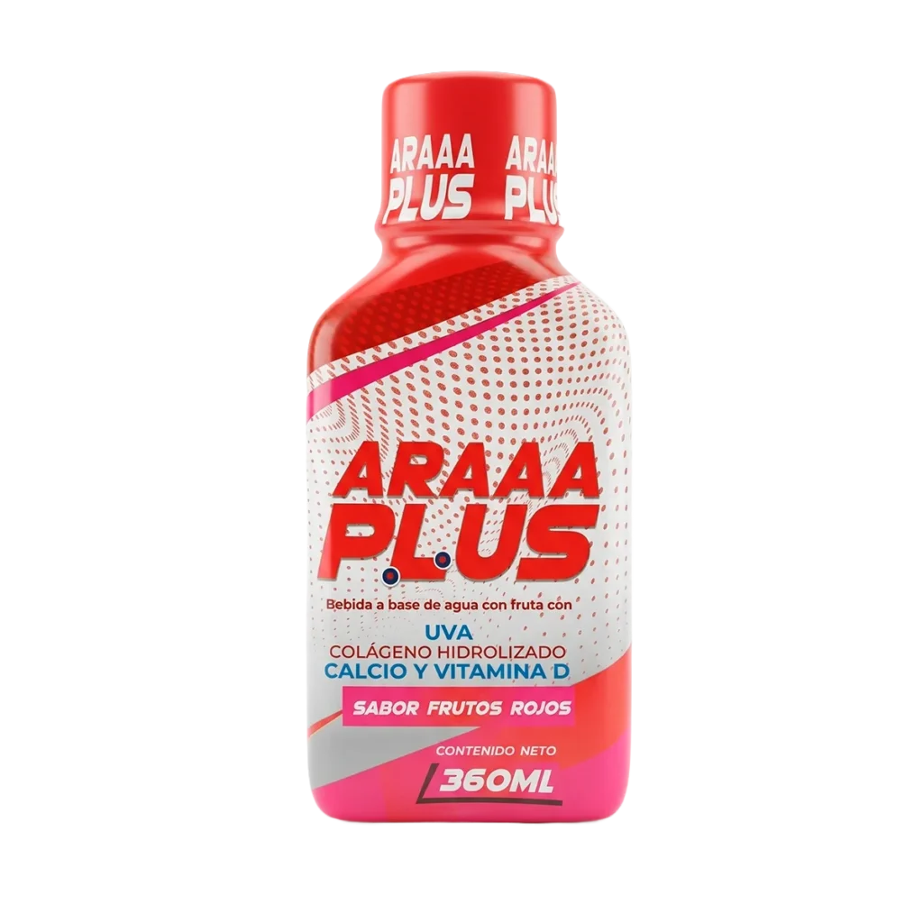 ARAAA PLUS es una bebida funcional elaborada a base de agua con fruta que combina colágeno hidrolizado, calcio y vitamina D, ingredientes esenciales que ayudan a complementar la nutrición diaria y apoyar el bienestar del organismo.