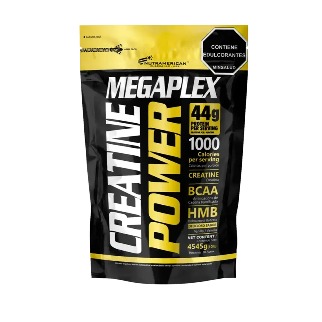Creatine Power Megaplex sabor vainilla de Nutramerican Pharma es un suplemento hipercalórico en presentación de 10 lb, formulado para complementar planes de alimentación enfocados en aumento de peso, recuperación y desarrollo muscular. Cada porción aporta 44 g de proteína y 1000 calorías, además de incluir creatina, BCAA y HMB, convirtiéndose en una excelente opción para quienes buscan un ganador de peso completo y de alto aporte energético.