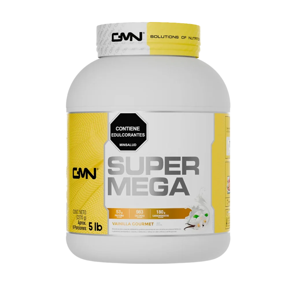 SUPER MEGA de GMN es un suplemento hipercalórico diseñado para apoyar el aumento de masa muscular y peso corporal. Cada porción aporta 53 gramos de proteína, 983 calorías y 180 gramos de carbohidratos, proporcionando la energía y los nutrientes necesarios para quienes buscan incrementar volumen muscular. Su fórmula combina proteína de suero, carbohidratos y aminoácidos esenciales para favorecer la recuperación y el desarrollo muscular.